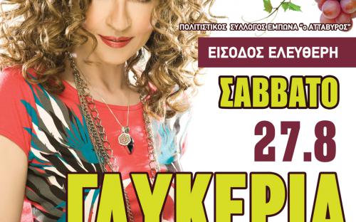 Την ψυχαγωγία μας φέτος αναλαμβάνει ένα από πιο σημαντικά ονόματα του Ελληνικού τραγουδιού. Η ΓΛΥΚΕΡΙΑ ! Με προίκα της ένα ρεπερτόριο που περιλαμβάνει αγαπημένα λαϊκά και παραδοσιακά τραγούδια και μια μεγάλη πορεία με λαμπρές συνεργασίες στο χώρο του Ελληνικού τραγουδιού η τραγουδίστρια που αγαπήθηκε ιδιαίτερα στην Ελλάδα και στο εξωτερικό, υπόσχεται να απογειώσει το κέφι και τη διάθεση γιορτής, στην κεντρική εκδήλωση το Σάββατο 27 Αυγούστου! Τη βραδιά θα συμπληρώσουν ο Στράτος Τσιρακάκης με τους μουσικούς του δίνοντας το δικό τους στίγμα στο γλέντι που αποτελεί συστατικό στοιχείο της Γιορτής του κρασιού.