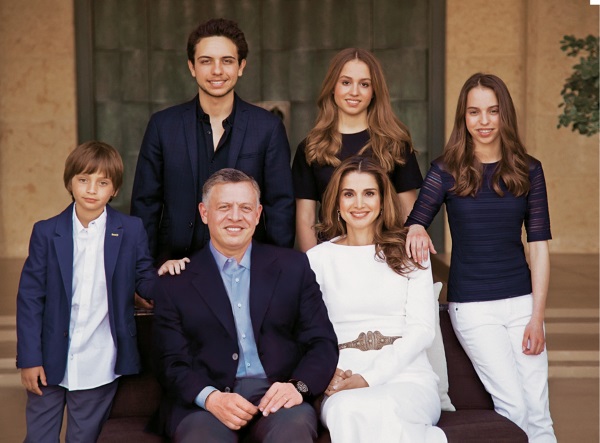 Το βασιλικό ζεύγος της Ιορδανίας με τα τέσσερα παιδιά τους. Τον βασιλιά Αμπντάλα και τη βασίλισσα Ράνια πλαισιώνουν (από αριστερά) οι πρίγκιπες Χασέμ και Χουσεΐν και οι πριγκίπισσες Ιμάν και Σάλμα