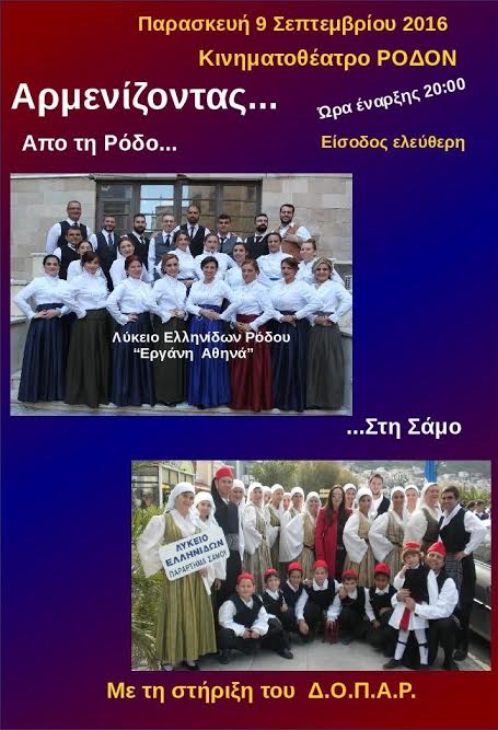 Το Λύκειο Ελληνίδων Ρόδου “ Εργάνη Αθηνά ” σε συνεργασία με το Λύκειο Ελληνίδων Σάμου παρουσιάζουν την παράσταση ... Αρμενίζοντας απο τη Ρόδο στη Σάμο ...