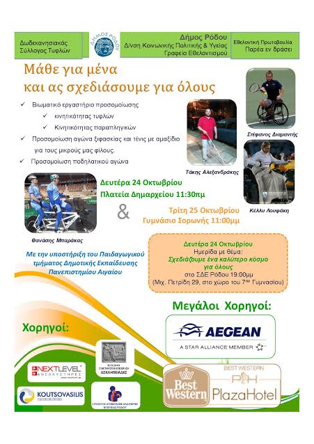 Ο Δήμος Ρόδου με το Γραφείο Εθελοντισμού, το Δωδεκανησιακό Σύλλογο Τυφλών και την Εθελοντική πρωτοβουλία «Παρέα εν δράσει» διοργανώνουν 2ήμερο εκδηλώσεων τη Δευτέρα 24 και Τρίτη 25 Οκτωβρίου 2016 με τίτλο: «Μάθε για μένα και ας σχεδιάσουμε για όλους».