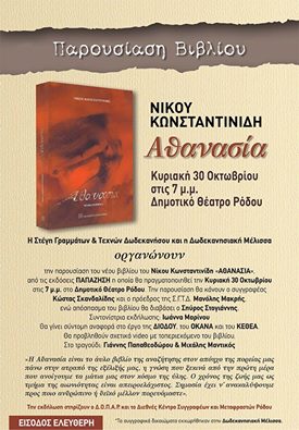 Η Στέγη Γραμμάτων και Τεχνών Δωδεκανήσου & η Δωδεκανησιακή Μέλισσα σας προσκαλούν στην παρουσίαση του νέου βιβλίου του Νίκου Κωνσταντινίδη «ΑΘΑΝΑΣΙΑ», από τις εκδόσεις ΠΑΠΑΖΗΣΗ, η οποία θα πραγματοποιηθεί την Κυριακή 30 Οκτωβρίου 2016 στις 7μ.μ. στο Δημοτικό Θέατρο Ρόδου.