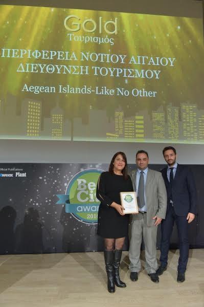 Χρυσό βραβείο έλαβε η Περιφέρεια Νοτίου Αιγαίου στα Best City Awards 2016 (Πυλώνας Α “Liveable City-Κατηγορία Τουρισμός”) για την ψηφιακή καμπάνια τουριστικής προβολής “Aegean Islands.Like NO Other” που σχεδίασε και υλοποιεί σε συνεργασία με τον ΣΕΤΕ και την Marketing Greece.
