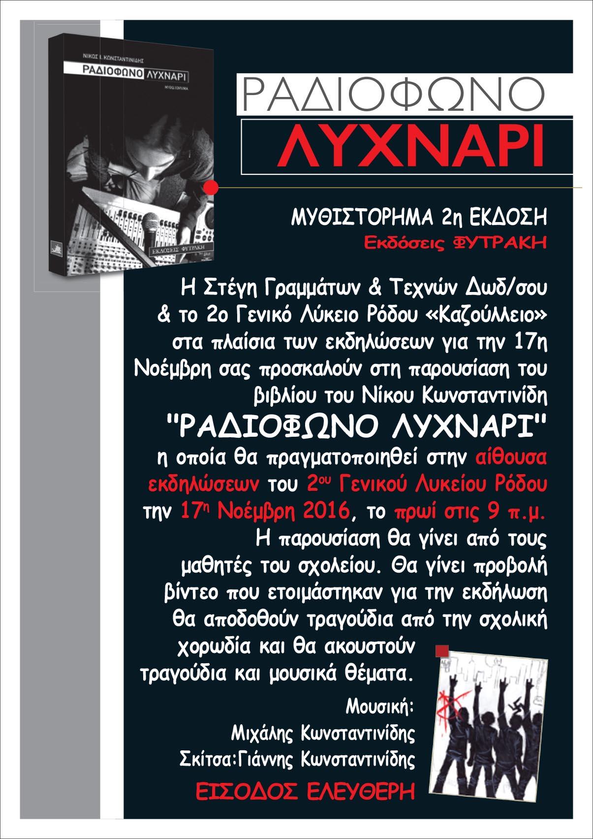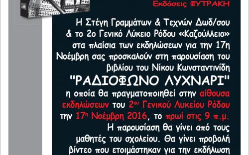 Η Στέγη Γραμμάτων & Τεχνών Δωδεκανήσου και το 2ο Γενικό Λύκειο Ρόδου - Καζούλλειο, στα πλαίσια των εκδηλώσεων για την 17η Νοέμβρη, σας προσκαλούν στη παρουσίαση του βιβλίου του Νίκου Κωνσταντινίδη "ΡΑΔΙΟΦΩΝΟ ΛΥΧΝΑΡΙ" η οποία θα πραγματοποιηθεί στην αίθουσα εκδηλώσεων του 2ου Γενικού Λυκείου Ρόδου την 17η Νοέμβρη 2016, το πρωί στις 9π.μ.