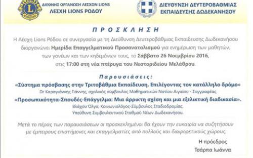 Γνωρίζοντας τις ιδιαίτερες εκπαιδευτικές ανάγκες και το συνεχώς μεταβαλλόμενο περιβάλλον στην αγορά εργασίας, η Λέσχη Lions Ρόδου σε συνεργασία με τη Διεύθυνση Δευτεροβάθμιας Εκπαίδευσης Δωδεκανήσου θα πραγματοποιήσει το Σάββατο 26 Νοεμβρίου 2016 στις 17:00 στη νέα πτέρυγα του Νεστοριδείου μελάθρου, ημερίδα για τον επαγγελματικό προσανατολισμό των μαθητών/τριών.