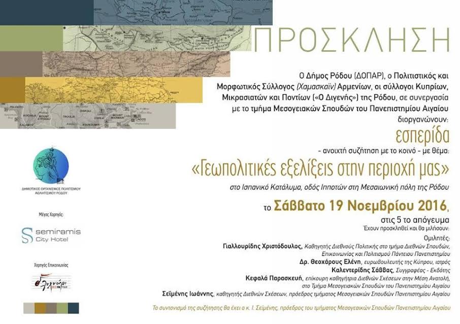 Ο Δήμος Ρόδου – ΔΟΠΑΡ και οι σύλλογοι, πολιτιστικός και μορφωτικός (Χαμαzκαϊν) των Αρμενίων, παραρτ. Δωδεκανήσου, των Κυπρίων, των Μικρασιατών και των Ποντίων (“ο Διγενής”) της Ρόδου, σε συνεργασία με το τμήμα Μεσογειακών Σπουδών του Πανεπιστημίου Αιγαίου διοργανώνουν εσπερίδα- ανοιχτή συζήτηση με το κοινό με θέμα: “ Γεωπολιτικές εξελίξεις στην περιοχή μας” στο Ισπανικό Κατάλυμα, οδός Ιπποτών, στη Μεσαιωνική πόλη της Ρόδου, το Σάββατο, 19 Νοεμβρίου 2016, στις 5 το απόγευμα.