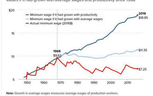 Κάθε ώρα εργασίας έπρεπε να αμοίβεται με 18,85$. Και όμως,το κατώτατο ωρομίσθιο είναι μόλις 7,25 $. Οι εργαζόμενοι ζητούν τουλάχιστον τα 11,35 $ που αντιστοιχούν στο μ.ο των μισθών της οικονομίας, ώστε να δημιουργηθούν προυποθέσεις σύγκλισης των εισοδηματικών ανισοτήτων. Θα δούμε παρακάτω πώς αυτό σχετίζεται και με την ελάχιστη έστω διδασκαλία μαρξιστικής θεωρίας στις ΗΠΑ.