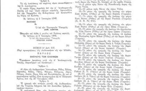 Σε τεσσερισήμιση  γραμμές ολοκληρώθηκε δια του άρθρου 1 του Νόμου 518/1948 η περιπόθητη «Προσάρτηση», «Ενωση» της Δωδεκανήσου μετά της Μητρός Ελλάδος.