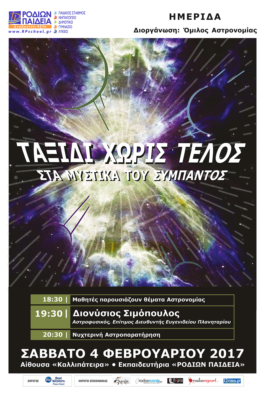Το Σάββατο 4 Φεβρουαρίου ο Όμιλος Αστρονομίας των Εκπαιδευτηρίων «ΡΟΔΙΩΝ ΠΑΙΔΕΙΑ» σας προσκαλεί σε ένα πρωτότυπο ταξίδι στο Σύμπαν για να ανακαλύψουμε μαζί τα κρυμμένα μυστικά του και για να κατανοήσουμε τις εκπληκτικές εικόνες του θαυμαστού κόσμου που μας περιβάλλει.