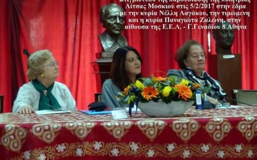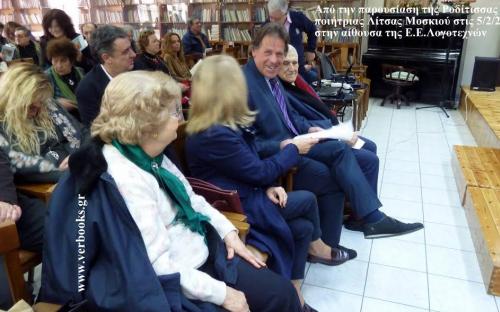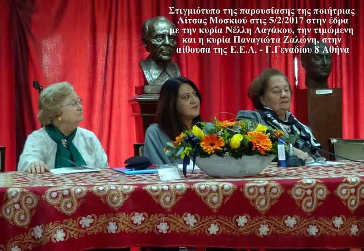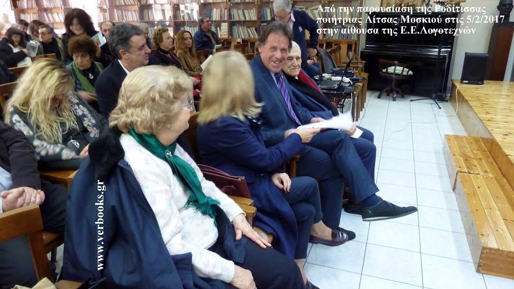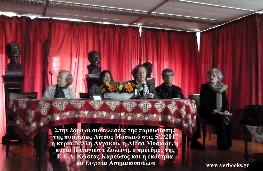 της Ροδίτισσας ποιήτριας Λίτσας Μοσκιού την Κυριακή 5 Φεβρουαρίου 2017 ώρα 12:00 στην αίθουσα Μιχαήλας Αβέρωφ της Εταιρίας Ελλήνων Λογοτεχνών (Γ. Γενναδίου 8, 7ος όροφος)