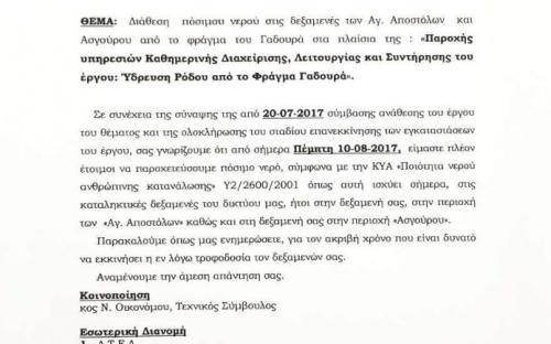 Την 10η/08/2017, ημέρα Πέμπτη και ώρα 10:46 πρωινή, η Περιφέρεια Νοτίου Αιγαίου με το έγγραφό της Δ.Τ.Ε/3118 (επισυναπτόμενο 1), ενημερώνει την ΔΕΥΑΡ ότι το Φράγμα Γαδουρά είναι έτοιμο να παροχετεύσει πόσιμο νερό στις καταληκτικές δεξαμενές της ΔΕΥΑΡ στις περιοχές Αγίων Αποστόλων και Ασγούρου, προκειμένου αυτό να δοθεί στους καταναλωτές.