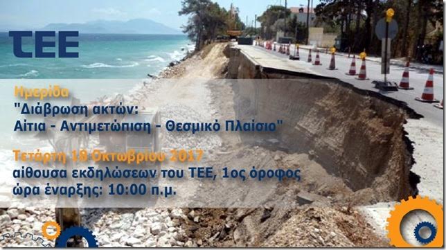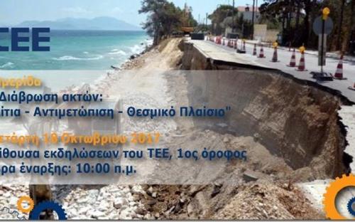 Τεχνική και επιστημονική ημερίδα για τη διάβρωση των ακτών διεξάγεται αύριο Τετάρτη στο ΤΕΕ. Η διάβρωση των ακτών είναι ένα πρόβλημα που αντιμετωπίζουν δεκάδες περιοχές της χώρας, πολλές μάλιστα ιδιαίτερα έντονα, και οι επιπτώσεις του αυξάνονται με το πέρασμα του χρόνου. Το Τεχνικό Επιμελητήριο Ελλάδας προσκαλεί κάθε ενδιαφερόμενο, τους επιστήμονες, τους μηχανικούς και τους αυτοδιοικητικούς παράγοντες στην ημερίδα που θα γίνει την Τετάρτη 18 Οκτωβρίου 2017, στις 10 το πρωί, στην Αίθουσα Εκδηλώσεων του ΤΕΕ (Νίκης 4, Σύνταγμα, 1ος όροφος) με θέμα: «Διάβρωση ακτών: Αίτια – Αντιμετώπιση – Θεσμικό Πλαίσιο». Η είσοδος στην ημερίδα είναι ελεύθερη, αλλά συμπληρώνετε τη φόρμα συμμετοχής εδώ: http://web.tee.gr/ekdilosi-