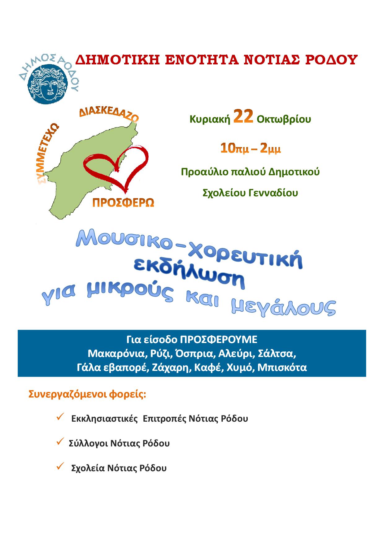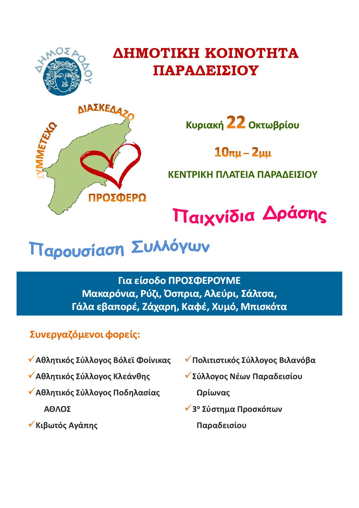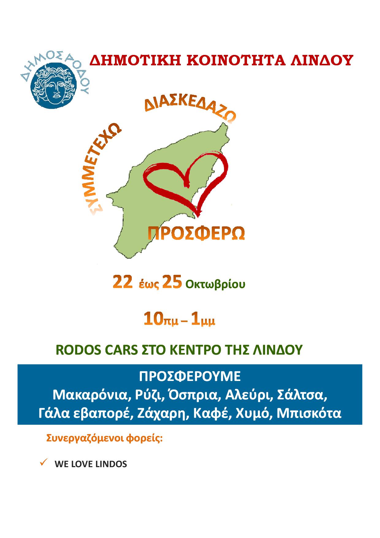 Την Κυριακή 22 Οκτωβρίου για πρώτη φορά σε 7 διαφορετικά μέρη του νησιού (Ροδίνι, Καλυθιές, Λίνδος, Αρχάγγελος, Παραδείσι, Λάερμα και Νότια Ρόδος) από τις 10 το πρωί μέχρι τις 2 το μεσημέρι διοργανώνουμε την εκδήλωση ΣΥΜΜΕΤΕΧΩ – ΔΙΑΣΚΕΔΑΖΩ – ΠΡΟΣΦΕΡΩ. Εθελοντικές οργανώσεις και εθελοντές πολίτες καταθέτουν δρώμενα για να διασκεδάσουμε όλοι μαζί και ταυτόχρονα ο καθένας μας με τις δυνάμεις του να προσφέρει. Το μοναδικό αντίτιμο για τη συμμετοχή στις εκδηλώσεις είναι η προσφορά τροφίμων μακράς διαρκείας και συγκεκριμένα Μακαρόνια, Ρύζι, Όσπρια, Αλεύρι, Ζάχαρη, Σάλτσα, Γάλα εβαπορέ, Καφές, Χυμός, Μπισκότα.