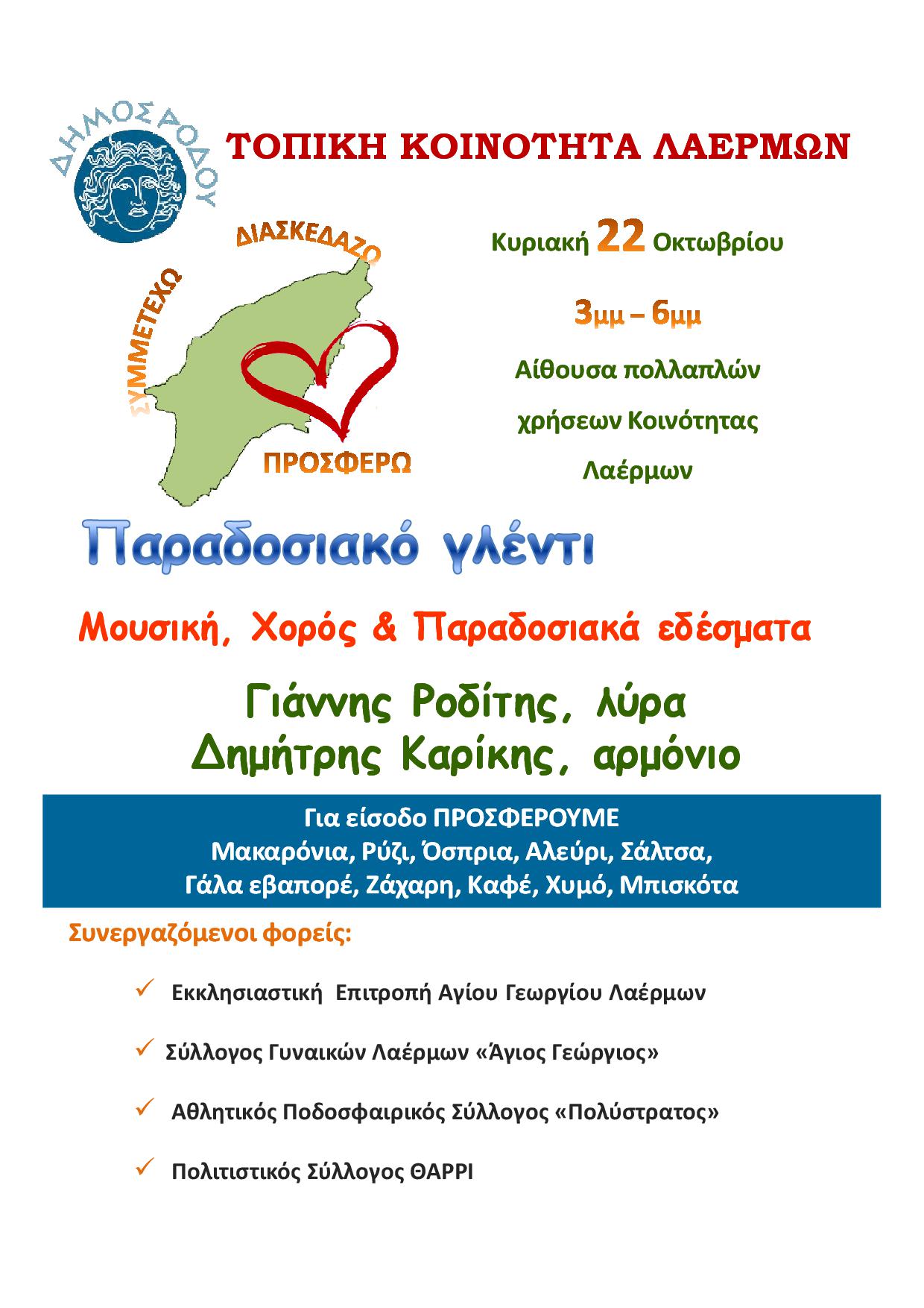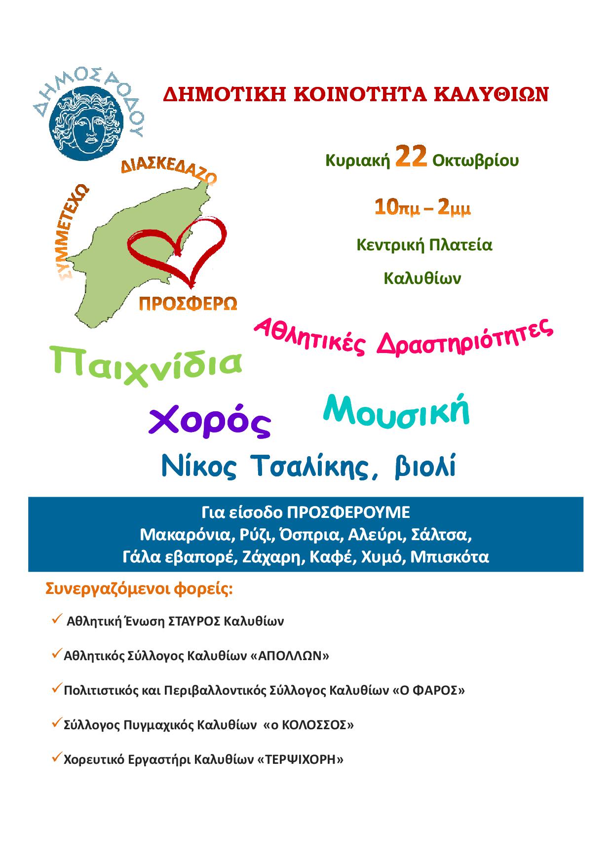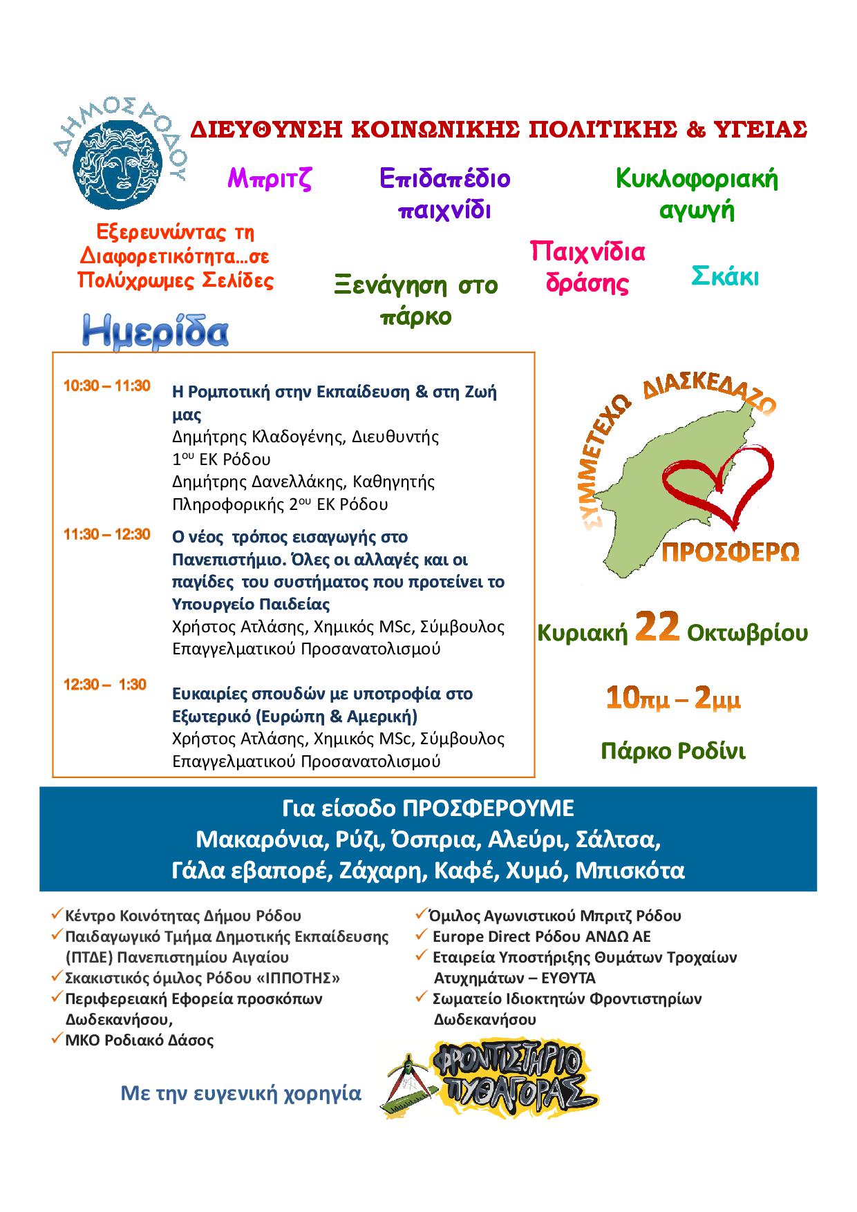 Την Κυριακή 22 Οκτωβρίου για πρώτη φορά σε 7 διαφορετικά μέρη του νησιού (Ροδίνι, Καλυθιές, Λίνδος, Αρχάγγελος, Παραδείσι, Λάερμα και Νότια Ρόδος) από τις 10 το πρωί μέχρι τις 2 το μεσημέρι διοργανώνουμε την εκδήλωση ΣΥΜΜΕΤΕΧΩ – ΔΙΑΣΚΕΔΑΖΩ – ΠΡΟΣΦΕΡΩ. Εθελοντικές οργανώσεις και εθελοντές πολίτες καταθέτουν δρώμενα για να διασκεδάσουμε όλοι μαζί και ταυτόχρονα ο καθένας μας με τις δυνάμεις του να προσφέρει. Το μοναδικό αντίτιμο για τη συμμετοχή στις εκδηλώσεις είναι η προσφορά τροφίμων μακράς διαρκείας και συγκεκριμένα Μακαρόνια, Ρύζι, Όσπρια, Αλεύρι, Ζάχαρη, Σάλτσα, Γάλα εβαπορέ, Καφές, Χυμός, Μπισκότα.
