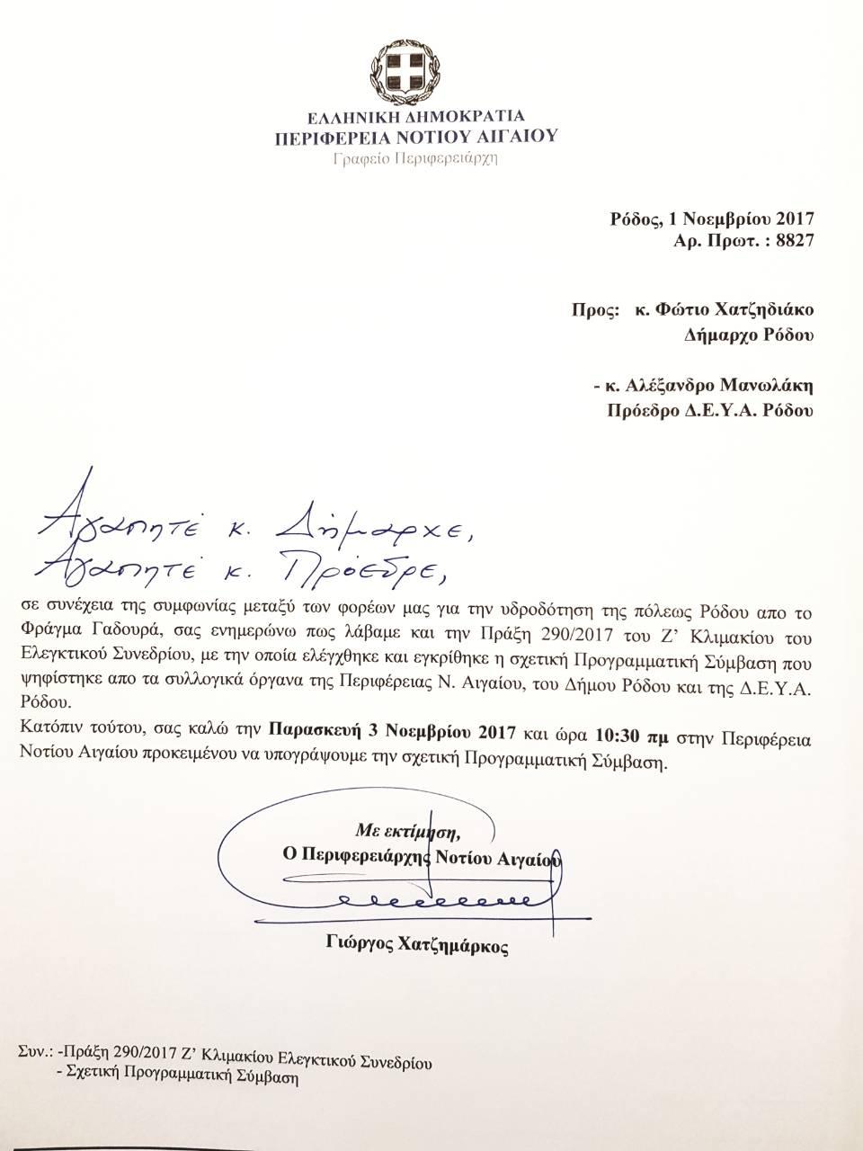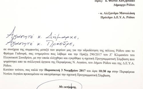 Μετά την κοινοποίηση στην Περιφέρεια της Πράξης 290/2017, του Ζ΄ Κλιμακίου του Ελεγκτικού Συνεδρίου, με την οποία ελέγχθηκε και εγκρίθηκε η σχετική Προγραμματική Σύμβαση που ψηφίστηκε από τα συλλογικά όργανα της Περιφέρειας Νοτίου Αιγαίου, του Δήμου Ρόδου και της ΔΕΥΑ Ρόδου, ο Περιφερειάρχης, απέστειλε σήμερα επιστολή στον Δήμαρχο Ρόδου, Φώτη Χατζηδιάκο και στον Πρόεδρο της ΔΕΥΑΡ, Αλέξανδρο Μανωλάκη, στους οποίους κοινοποιεί την απόφαση του Ελεγκτικού Συνεδρίου και τους καλεί, την Παρασκευή, 3 Νοεμβρίου 2017 και ώρα 10:30πμ στην Περιφέρεια, προκειμένου να συνυπογράψουν την Προγραμματική Σύμβαση.