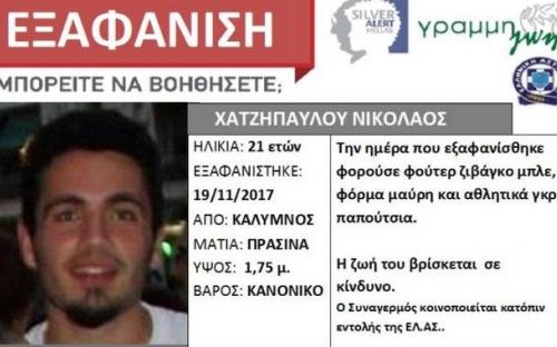 Ο φοιτητής του Εθνικού Μετσόβιου Πολυτεχνείου εξαφανίστηκε το μεσημέρι της περασμένης Κυριακής, 19 Νοεμβρίου από το κέντρο της Καλύμνου.