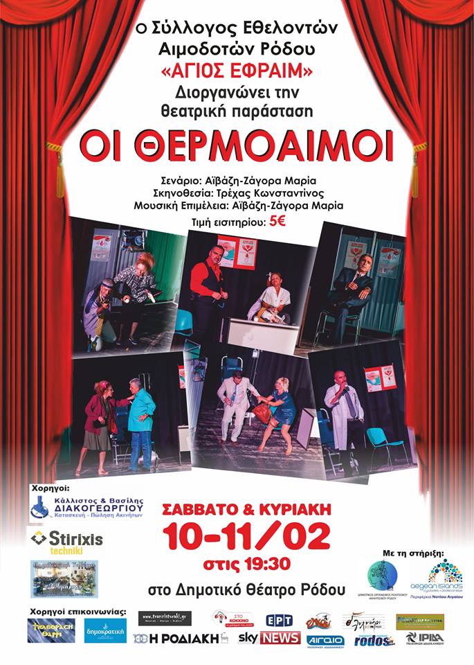 Σήμερα 10 και αύριο 11 Φεβρουαρίου, στο Δημοτικό Θέατρο Ρόδου, στις 7.30 το απόγευμα, οι ροδίτες θα έχουν την ευκαιρία να απολαύσουν ξανά τους ταλαντούχους εραστές της υποκριτικής τέχνης, στο θεατρικό έργο «Οι Θερμόαιμοι».