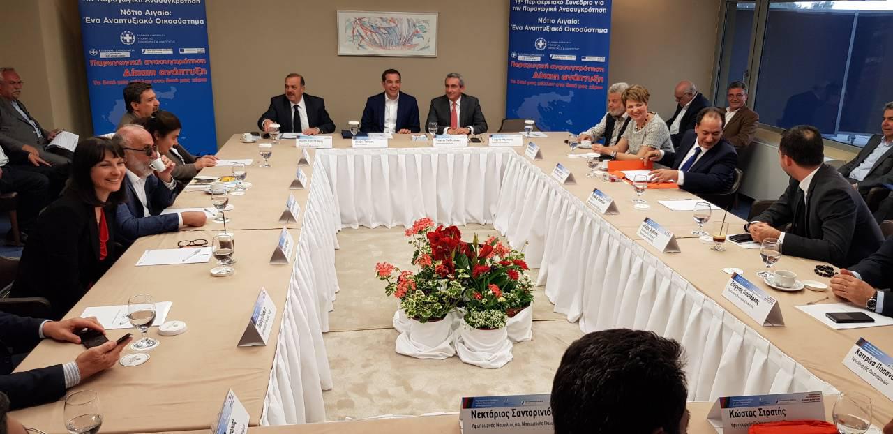 Παρόντος του πρωθυπουργού, μεγάλου αριθμού υπουργών, υφυπουργών και γενικών γραμματέων των υπουργείων που συμμετείχαν στις 8 παράλληλες θεματικές συνεδρίες του διήμερου συνεδρίου, παρόντων των εκπροσώπων της αυτοδιοίκησης, των τοπικών αρχών και φορέων και κόσμου, ο Περιφερειάρχης κάλεσε την κυβέρνηση να εμπιστευτεί τις δυνατότητες του Νοτίου Αιγαίου, μιας περιοχής που δεν δίστασε να βάλει πλάτη στη χώρα, στις δύσκολες στιγμές της και που θα το ξανακάνει αν χρειαστεί, με «αντάλλαγμα» την υποστήριξη των νησιών του στην προσπάθεια αξιοποίησης των ευκαιριών και των δυνατοτήτων που έχει και που μέχρι σήμερα παραμένουν αναξιοποίητες, με σοβαρές επιπτώσεις όχι μόνο για το Νότιο Αιγαίο αυτό καθ΄αυτό, αλλά και για τη χώρα συνολικά, που στερείται σημαντικό ποσοστό του ΑΕΠ και θέσεων εργασίας.
