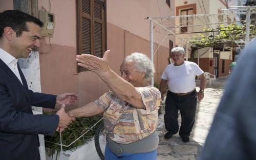 Αργότερα συνάντησε τον γηραιότερο κάτοικο του νησιού, τον Μιχάλη Χατζηγιακουμή, 94 χρονών, ο οποίος πήρε να του λέει για την ιστορία του νησιού και τις καταστάσεις που έζησε ο ίδιος. «Είσαι η ζωντανή ιστορία του Καστελόριζου» του είπε ο κ. Τσίπρας και ο Μιχάλης Χατζηγιακουμής είπε ότι η παρουσία του πρωθυπουργού «δίνει μια άλλη μορφή ζωής στο Καστελόριζο».