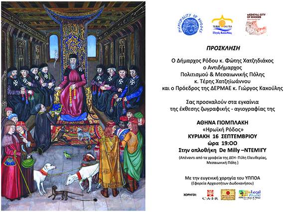 Έκθεση της ζωγράφου και αγιογράφου Αθηνάς Γιομπλάκη με θέμα «Ηρωική Ρόδος», διοργανώνει ο Δήμος Ρόδου και η ΔΕΡΜΑΕ στην οπλοθήκη De Milly (Ντεμιγύ- απέναντι από τα γραφεία της ΔΕΗ) στην Πύλη Ελευθερίας, από τις 16 Σεπτεμβρίου έως και τις 15 Οκτωβρίου.