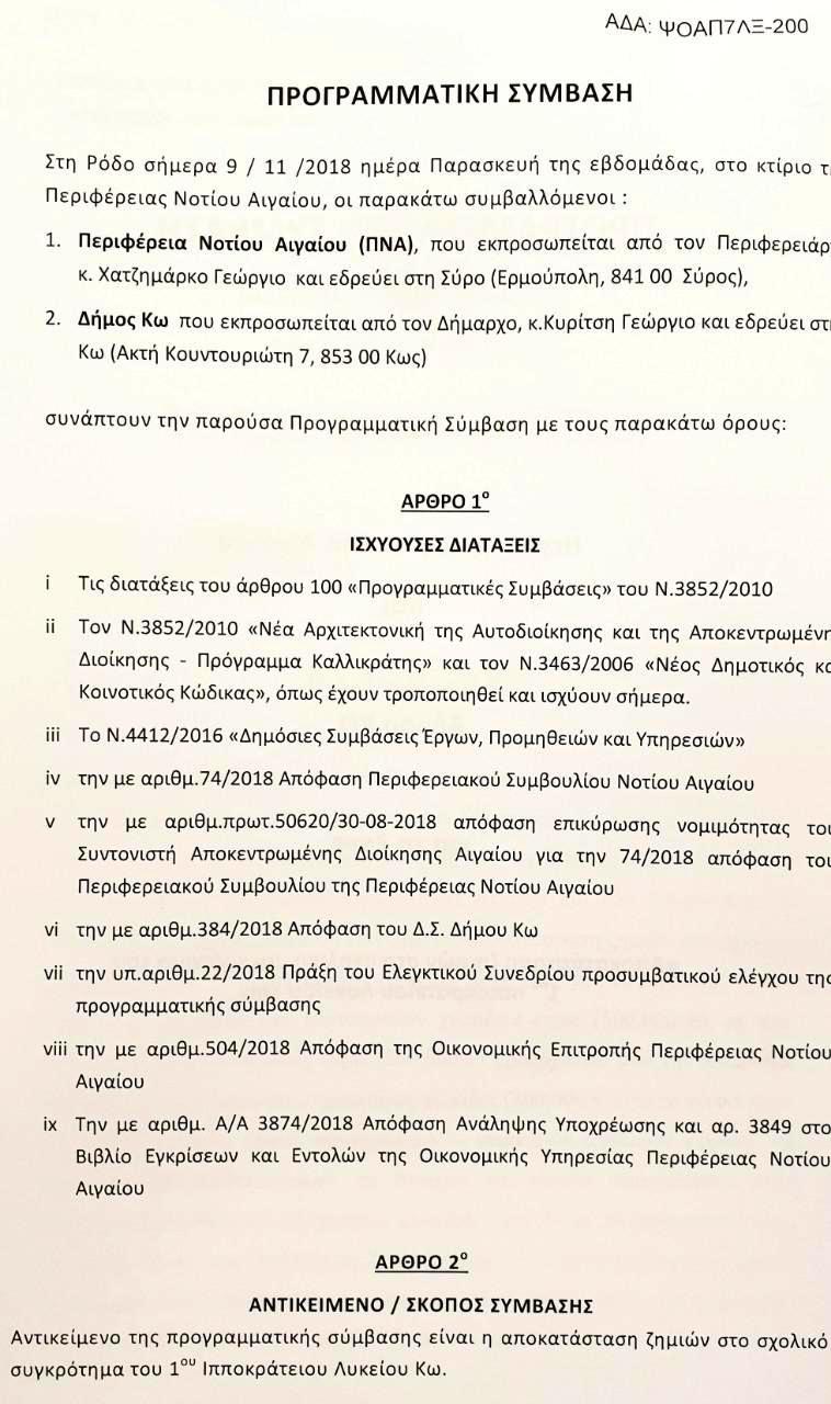 Η Προγραμματική Σύμβαση μεταξύ Περιφέρειας Ν. Αιγαίου και Δήμου Κω υπογράφηκε και αναρτήθηκε στις 9 Νοεμβρίου 2018, δηλαδή πριν από 7 ημέρες!