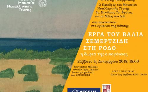 Tο Σάββατο 1 Δεκεμβρίου, το Μουσείο Νεοελληνικής Τέχνης του Δήμου Ρόδου, θα καταγράψει στο πλούσιο ημερολόγιο των πεπραγμένων της 58χρονης ιστορίας του, ένα ακόμη σημαντικό εικαστικό γεγονός. Πρόκειται για τα εγκαίνια της έκθεσης – μόνιμης συλλογής 103 έργων Ζωγραφικής, χαρακτικής, ενός σημαντικού καλλιτέχνη του περασμένου αιώνα, του Βάλια Σεμερτζίδη.