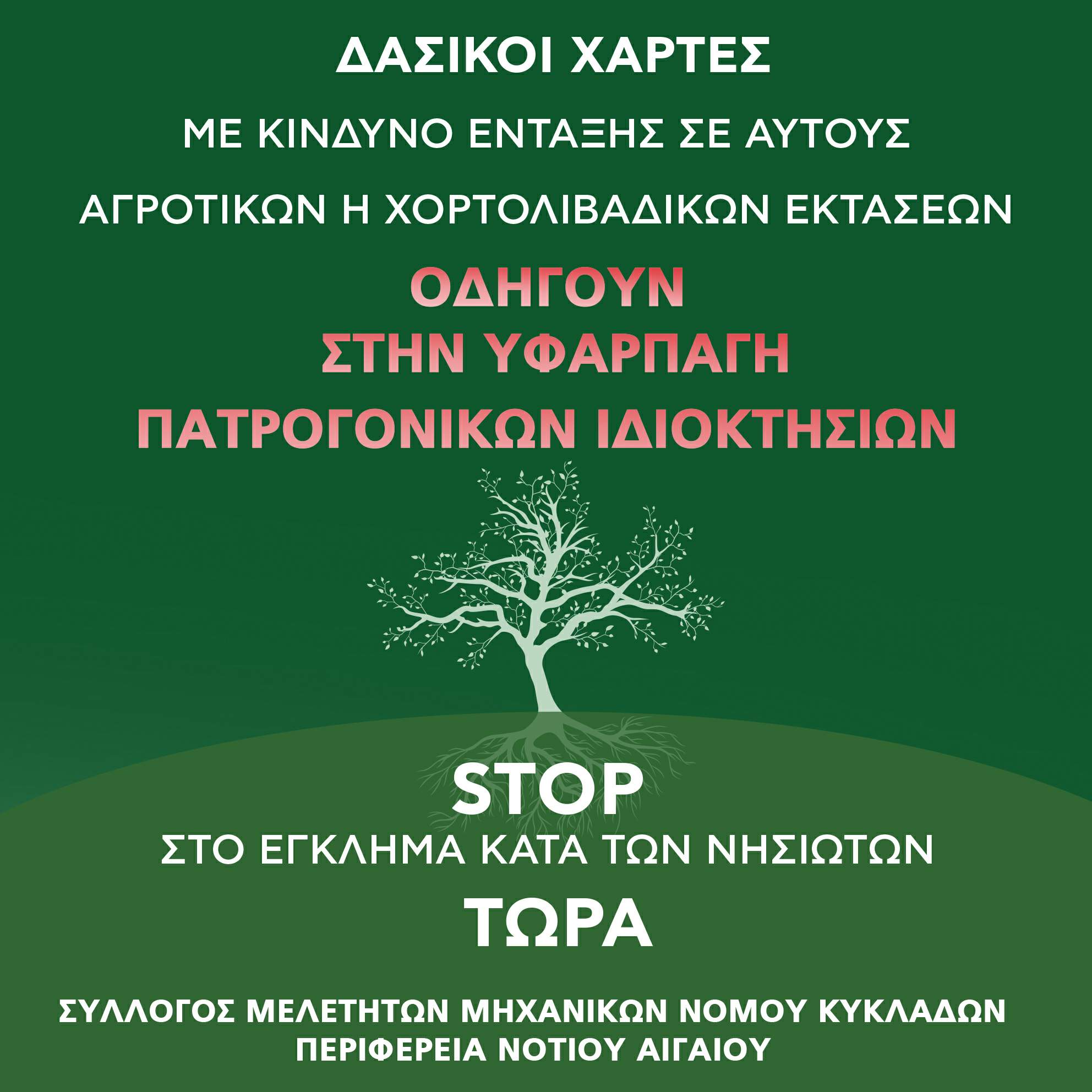 Στα νησιά των Κυκλάδων που έχουν αναρτηθεί οι δασικοί χάρτες (Σύρος, Μύκονος, Σαντορίνη, Σίφνος, Σίκινος, Φολέγανδρος, Μήλος, Κίμωλος και Ανάφη) χιλιάδες ιδιοκτήτες αγροτεμαχίων βρίσκονται αντιμέτωποι με την απώλεια της περιουσίας τους!