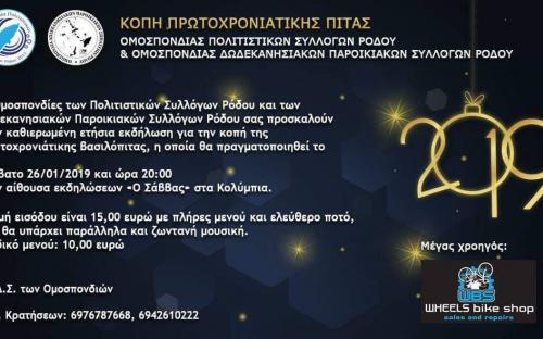 Οι Ομοσπονδίες των Πολιτιστικών Συλλόγων Ρόδου και των Δωδεκανησιακών Παροικιακών Συλλόγων Ρόδου σας προσκαλούν στην καθιερωμένη ετήσια εκδήλωση για την κοπή της πρωτοχρονιάτικης βασιλόπιτας, η οποία θα πραγματοποιηθεί το
