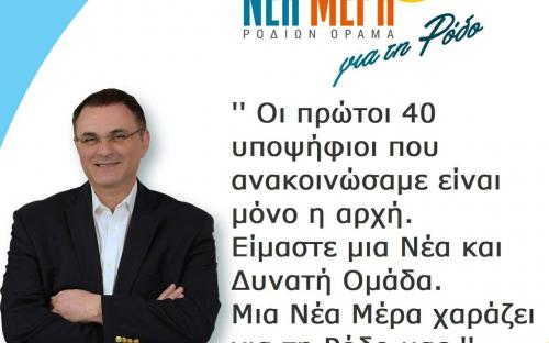 ‘’ Οι 40 νέοι υποψήφιοι, που ανακοινώθηκαν σήμερα, είναι μόνο η αρχή. Είμαστε μια Νέα και Δυνατή Ομάδα. Μια ΝΕΑ ΜΕΡΑ χαράζει για τη Ρόδο. Θέλω να ευχαριστήσω όλους αυτούς τους ανθρώπους που συμμετέχουν στην κοινή μας προσπάθεια και να τους ευχηθώ καλή επιτυχία.’’