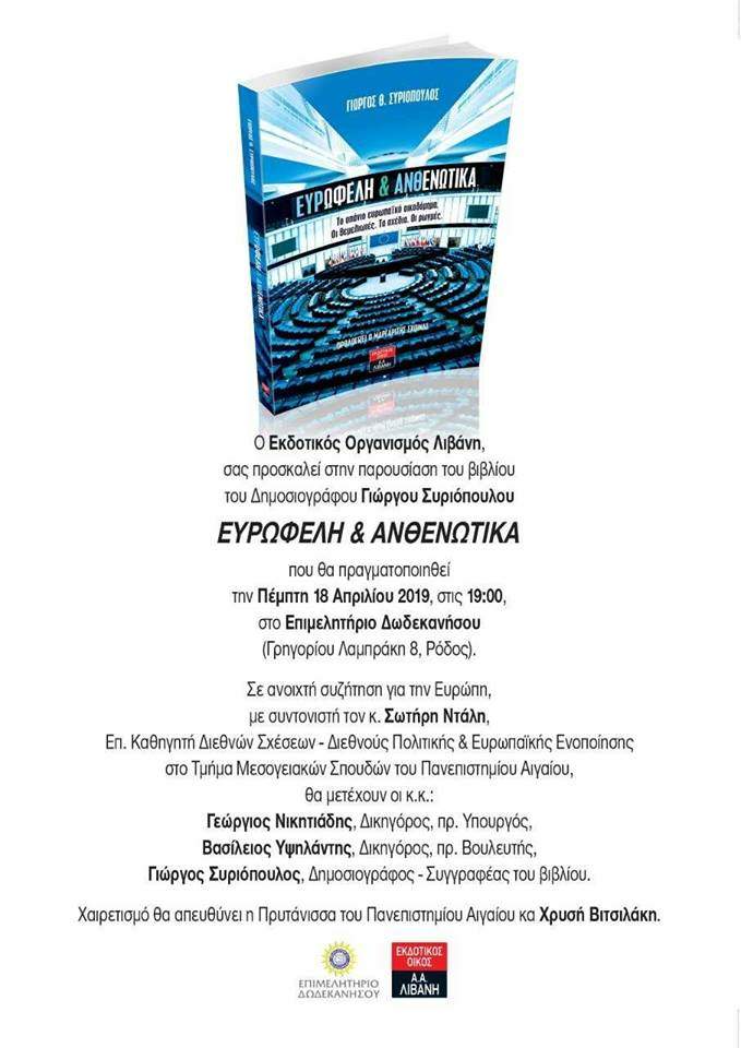 Θα είναι μεγάλη η χαρά μου να σας δω, την προσεχή Πέμπτη 18.4.2019 και ώρα 19.00 μ.μ στο Επιμελητήριο Δωδεκανήσου, στην παρουσίαση του βιβλίου του Γιώργου Συριόπουλου «ΕΥΡΩΦΕΛΗ & ΑΝΘΕΝΩΤΙΚΑ», εκδόσεις ΛΙΒΑΝΗ, κατά την οποία θα μιλήσω για το βιβλίο και θα συζητήσουμε για την Ευρώπη μαζί με τον συγγραφέα, τον κ. Γιώργο Νικητιάδη, π. υφυπουργό Τουρισμού και τον Καθηγητή κ. Σωτήρη Ντάλη.