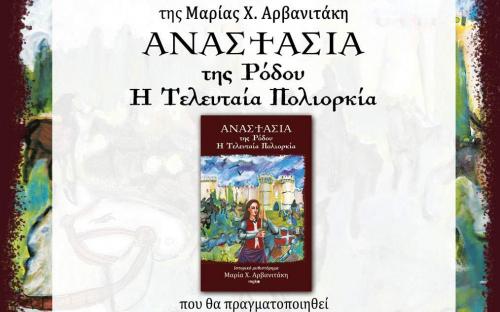 Το ιστορικό μυθιστόρημα της Μαρίας Χ. Αρβανιτάκη «Η Αναστασία της Ρόδου: Η Τελευταία Πολιορκία» παρουσιάζεται επίσημα την Πέμπτη, 13 Ιουνίου 2019, στις 19:30 στη Νέα Πτέρυγα του Νεστοριδείου Μελάθρου από τις εκδόσεις mgk.advertising και το Σπίτι της Ευρώπης στη Ρόδο.