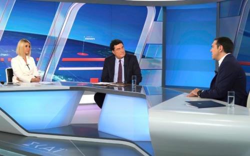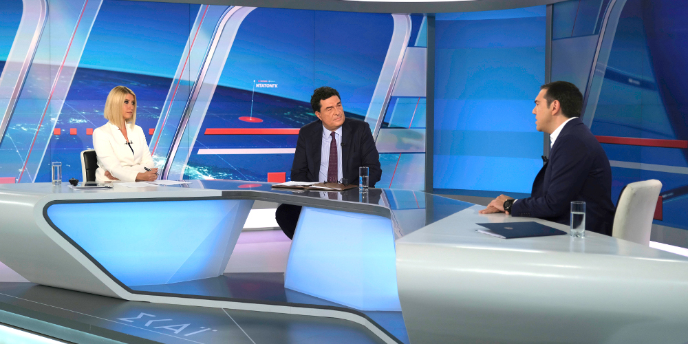 το στούντιο του ΣΚΑΪ βρέθηκε το βράδυ της Τρίτης ο Αλέξης Τσίπρας, σπάζοντας το εμπάργκο που είχε ο ίδιος επιβάλει.Η συνέντευξη εφ’ όλης της ύλης στο κεντρικό δελτίο ειδήσεων του ΣΚΑΪ έγινε από την Σία Κοσιώνη και το διευθυντή της «Καθημερινής» Αλέξη Παπαχελά.