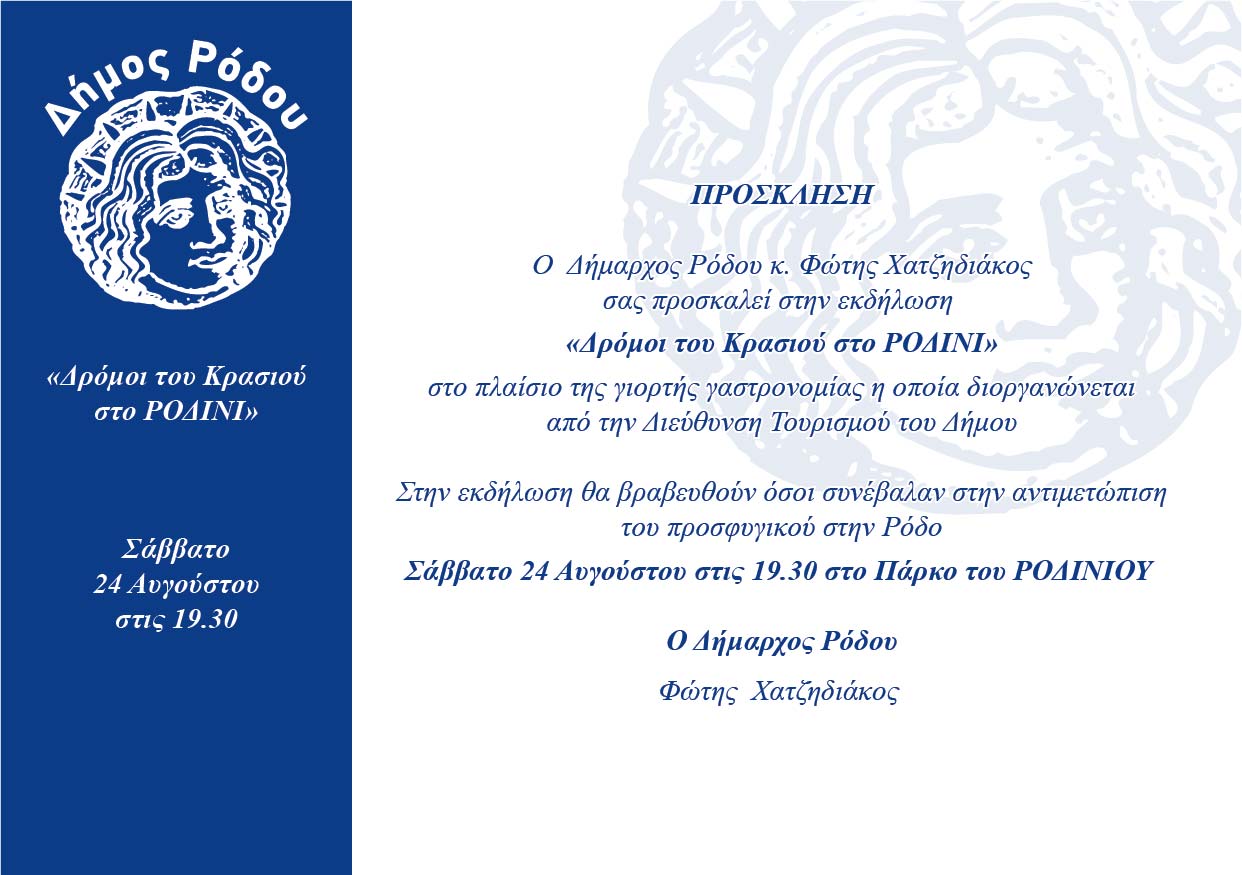 Μία ξεχωριστή εκδήλωση με τίτλο «Δρόμοι του κρασιού στο Ροδίνι» και με επίκεντρο τα μοναδικά ροδίτικα κρασιά, την τοπική μας παράδοση και την ντόπια γαστρονομία, διοργανώνει η Διεύθυνση Τουρισμού του Δήμου Ρόδου στο πλαίσιο της καθιερωμένης ετήσιας Γιορτής Γαστρονομίας, στις 7.30 το βράδυ του Σαββάτου 24 Αυγούστου 2019, στον μοναδικό χώρο του Ροδινιού.