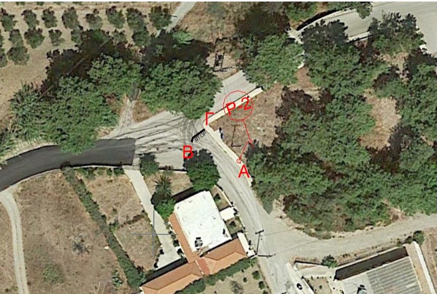 Ειδικότερα, τα οχήματα που εξέρχονται από τον παιδικό σταθμό που βρίσκεται επί της οδού Ελευθερίας, υποχρεούνται σε διακοπή πορείας (STOP) και σε παραχώρηση προτεραιότητας έναντι των οχημάτων που κινούνται στην ανώνυμη οδό που οδηγεί στο Δημοτικό σχολείο, όπως φαίνεται και στο παρακάτω απόσπασμα ορθοφωτοχάρτη.