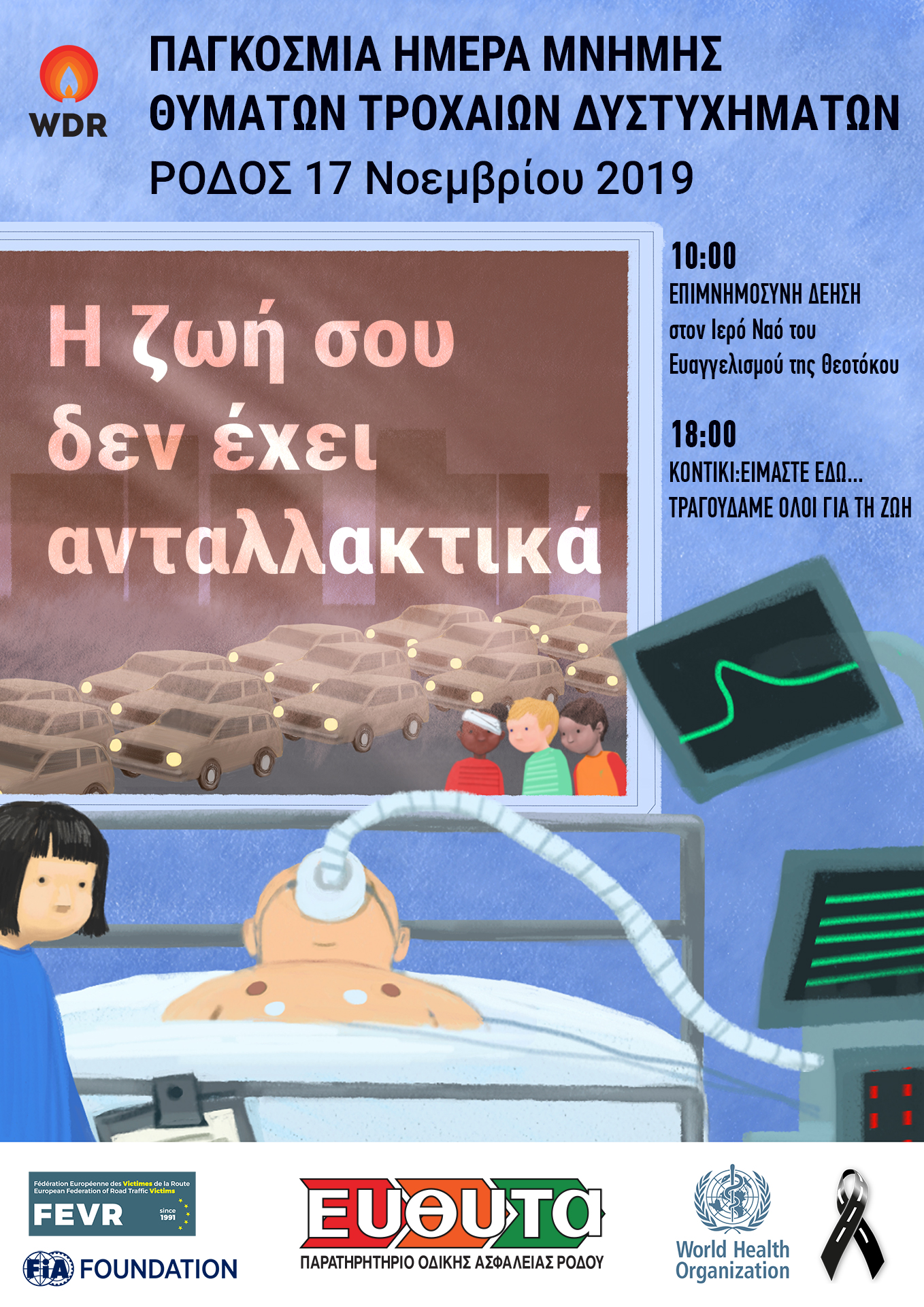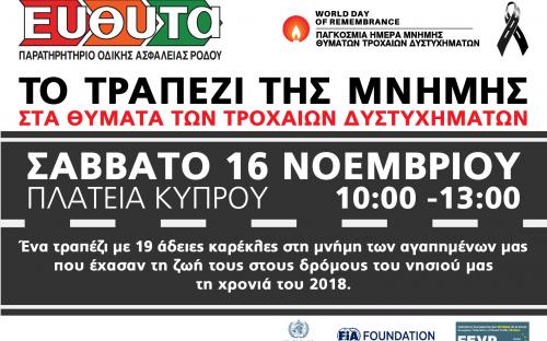 Στο πλαίσιο της Παγκόσμιας Ημέρα Μνήμης Θυμάτων Τροχαίων, η ΕΥΘΥΤΑ-ΠΑΡΑΤΗΡΗΤΗΡΙΟ ΟΔΙΚΗΣ ΑΣΦΑΛΕΙΑΣ ΡΟΔΟΥ, πραγματοποιεί τις εκδηλώσεις Κυριακή 17 Νοεμβρίου 2019