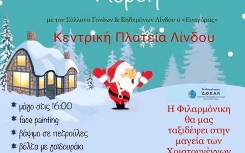 Ο Σύλλογος Γονέων & Κηδεμόνων Λίνδου σε συνεργασία με τον Δημοτικό Οργανισμό Πολιτισμού Αθλητισμού Ρόδου (Δ.Ο.Π.Α.Ρ.) και την Τοπική Κοινότητα Λίνδου προσκαλεί μικρούς και μεγάλους στην Χριστουγεννιάτικη Γιορτή , την Κυριακή 1 Δεκεμβρίου, στις 15:30, στην Κεντρική Πλατεία Λίνδου.