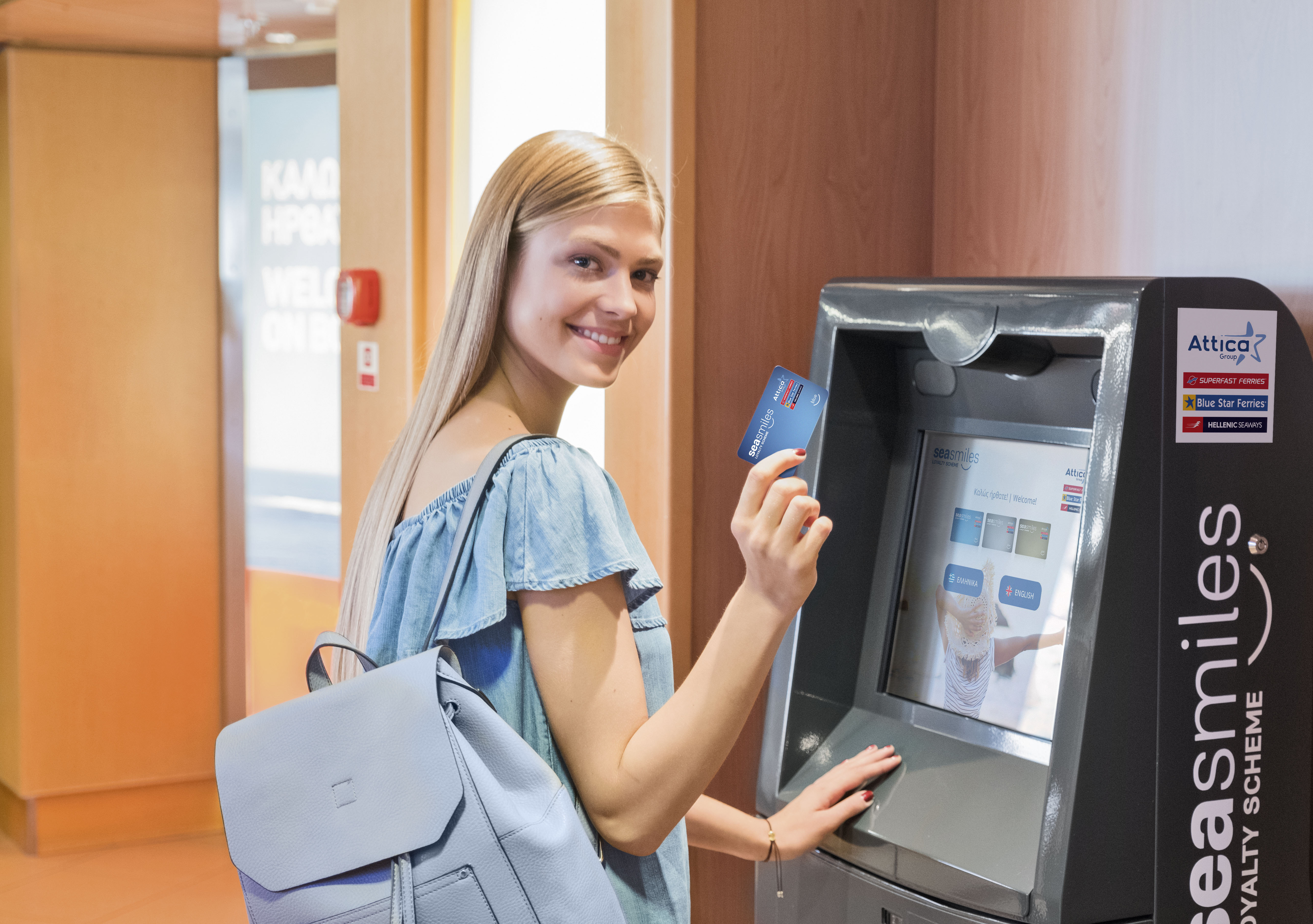 Η AtticaGroup,αξιοποιώντας την ψηφιακή τεχνολογία τόσο στον επικοινωνιακό σχεδιασμό όσο και στην εμπειρία επίσκεψηςτου καταναλωτήεν πλω, έχει θέσει σε λειτουργία ειδικά Kiosksεξυπηρέτησηςσε βασικές υπηρεσίες του προγράμματος Seasmiles, στα πλοία των εταιρειών SUPERFAST FERRIES, BLUE STAR FERRIES και HELLENIC SEAWAYS.