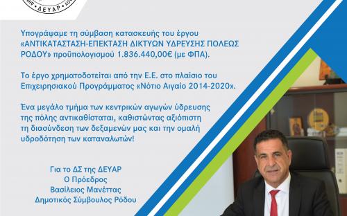 Υπογράψαμε τη σύμβαση κατασκευής του έργου «ΑΝΤΙΚΑΤΑΣΤΑΣΗ-ΕΠΕΚΤΑΣΗ ΔΙΚΤΥΩΝ ΥΔΡΕΥΣΗΣ ΠΟΛΕΩΣ ΡΟΔΟΥ» προϋπολογισμού 1.836.440,00€ (με ΦΠΑ).