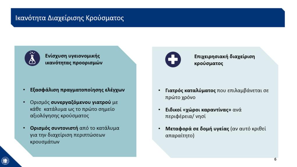 Ο δεύτερος άξονας αφορά τη διαχείριση των κρουσμάτων, με το γιατρό καταλύματος να επιλαμβάνεται σε πρώτο χρόνο και την ίδια στιγμή θα υπάρχει μέριμνα για ειδικούς χώρους για καραντίνα ανά προορισμό και πρόνοια για μεταφορά σε ιατρική δομή αν αυτό κριθεί σκόπιμο.