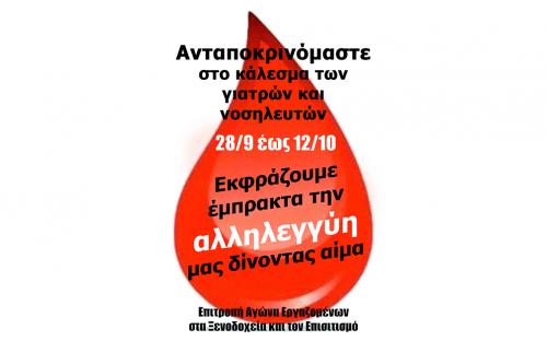Η Επιτροπή Αγώνα Εργαζομένων στα Ξενοδοχεία και τον Επισιτισμό οργανώνει εθελοντική αιμοδοσία ή οποία έχει ήδη ξεκινήσεις από τις 28/9 ως και θα ολοκληρωθεί στις 12/10, ανταποκρινόμενη στο κάλεσμα που πρόσφατα απηύθυνε η Ομοσπονδία των Νοσοκομειακών Γιατρών και στις ανάγκες που υπάρχουν αυτή την περίοδο.
