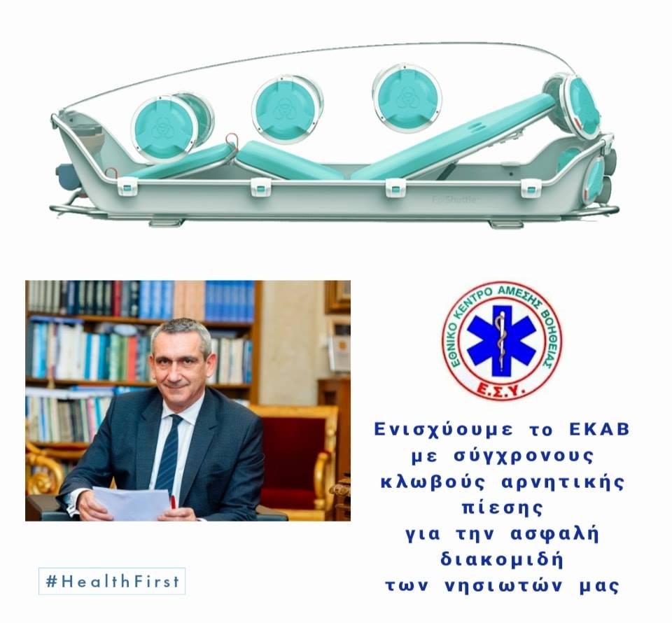 - Ενίσχυση του ΕΚΑΒ με σύγχρονους κλωβούς αρνητικής πίεσης για την ασφαλή διακομιδή των νησιωτών μας.