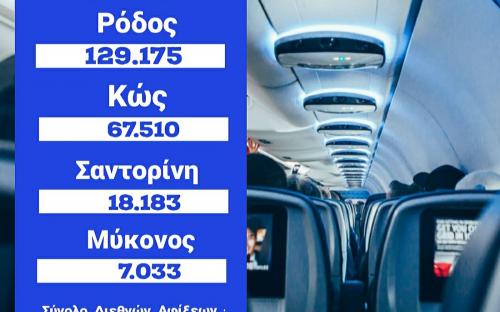 Από το άνοιγμα της σεζόν, τα Δωδεκάνησα και οι Κυκλάδες καταγράφουν 1,2 εκατομμύρια διεθνείς αφίξεις, ενώ την Ρόδο επέλεξαν για τις διακοπές τους 585.000 ξένοι τουρίστες, αποκλειστικά μέσω του διεθνούς αεροδρομίου «Διαγόρας».
