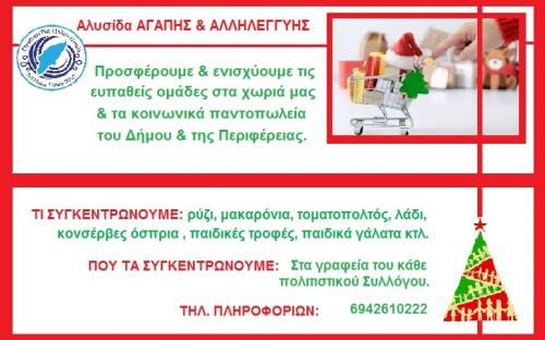 Γνωρίζουμε ότι πολιτιστικά φέτος τα Χριστούγεννα οφείλουμε για λόγους υγείας να είμαστε αδρανείς, παρόλα αυτά όμως θεωρούμε ότι είναι χρέος μας να δείξουμε το κοινωνικό πρόσωπό μας και να βοηθήσουμε συμπολίτες μας που βρίσκονται σε δύσκολη οικονομική κατάσταση.