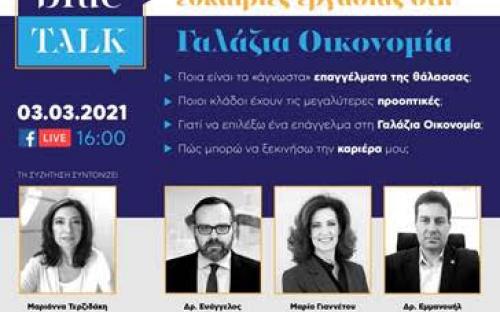 Το πρώτο blueTALK διοργανώνεται από την Μίλητος Συμβουλευτική Α.Ε., υπό την αιγίδα του Junior Achievement Greece, την Τετάρτη 03/03/2021 στις 16:00 σε ζωντανή αναμετάδοση στο Facebook στη σελίδα της ευρωπαϊκής πρωτοβουλίας BlueGenerationProjectGreece που στοχεύει να προσφέρει καθοδήγηση, σε +40.000 νέους, ηλικίας 15-29 ετών για τα «Επαγγέλματα της Θάλασσας», ώστε να σχεδιάσουν μια επιτυχημένη επαγγελματική σταδιοδρομία στη Γαλάζια Οικονομία.