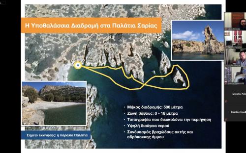 Η ολοκλήρωση των εκπαιδευτικών-ενημερωτικών εκδηλώσεων πραγματοποιήθηκε με την υλοποίηση της 3ης ημερίδας με τίτλο «Παρουσίαση της Υποθαλάσσιας Διαδρομής στα Παλάτια της νήσου Σαρίας». Στην ημερίδα παρουσιάστηκε από τους ερευνητές του ΕΛΚΕΘΕ, Δρ. Θάνο Νταϊλιάνη και Δρ. Βασίλη Γεροβασιλείου, το υποβρύχιο τοπίο, ο βιόκοσμος και τα θαλάσσια σπήλαια που βρίσκονται κατά μήκος της Υποθαλάσσιας Διαδρομής που σχεδιάστηκε στο πλαίσιο της Πράξης. Επίσης, πραγματοποιήθηκε η προβολή του video της υποθαλάσσιας διαδρομής και αναδείχθηκαν οι δυνατότητες προώθησής της από τον Γεν. Διευθυντή του KARPATHOS TRAVEL, κ. Μιχάλη Ρεΐση.