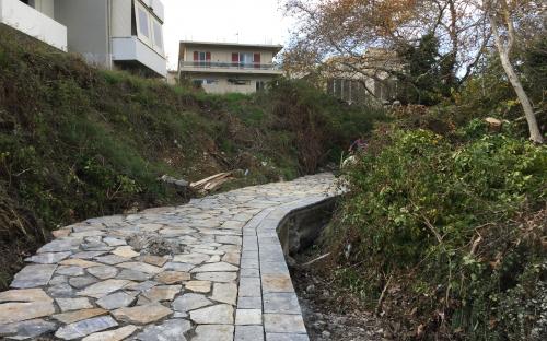 - Στο διάδρομο που ξεκινά από το Δημοτικό Σχολείο, διατρέχει τη ρεματιά και καταλήγει στην πλατεία των πηγών «Φασούλι». Εκεί θα γίνει πλακόστρωση με πλάκες Λάρδου ακανόνιστης και τετραγωνικής μορφής ενώ το κράσπεδο θα είναι ελαφρά οπλισμένο με σκυρόδεμα και θα καλουπωθεί με επεξεργασμένη ξυλεία. Στο μέσο του διαδρόμου θα κατασκευαστεί μια μεταλλική γέφυρα, το δάπεδο της οποίας θα είναι επενδυμένο από λωρίδες ξύλου, ενώ στις δύο πλευρές της γέφυρας θα τοποθετηθούν κιγκλιδώματα για λόγους ασφαλείας.