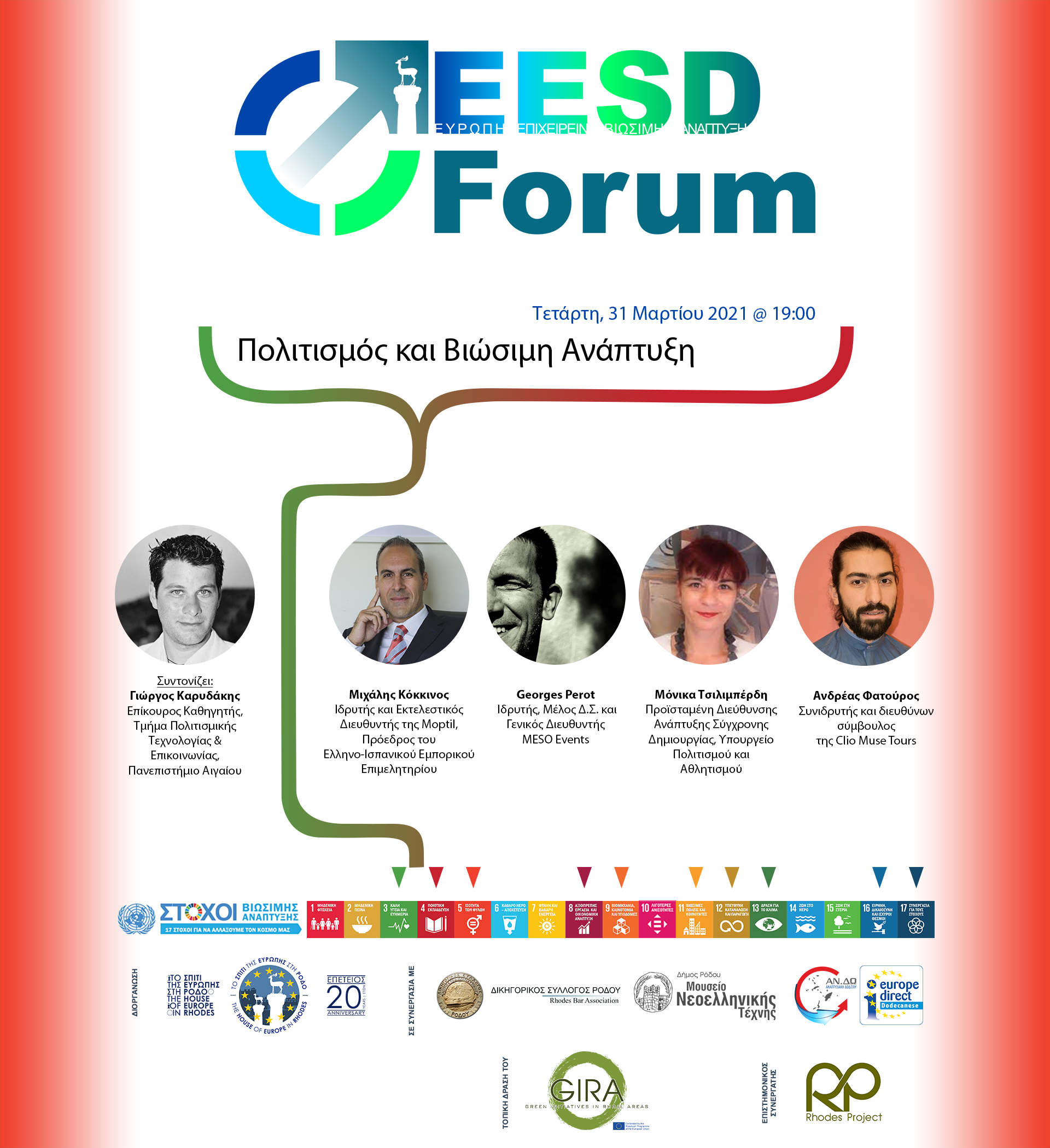 Το EESD Forum 2021 διοργανώνεται από το Σπίτι της Ευρώπης στη Ρόδο σε συνεργασία με το Δικηγορικό Σύλλογο Ρόδου, το Μουσείο Νεοελληνικής Τέχνης του Δήμου Ρόδου και το Κέντρο Ευρωπαϊκής Πληροφόρησης - Europe Direct Δωδεκανήσου της ΑΝ.ΔΩ., με επιστημονικό συνεργάτη το Rhodes Project.
