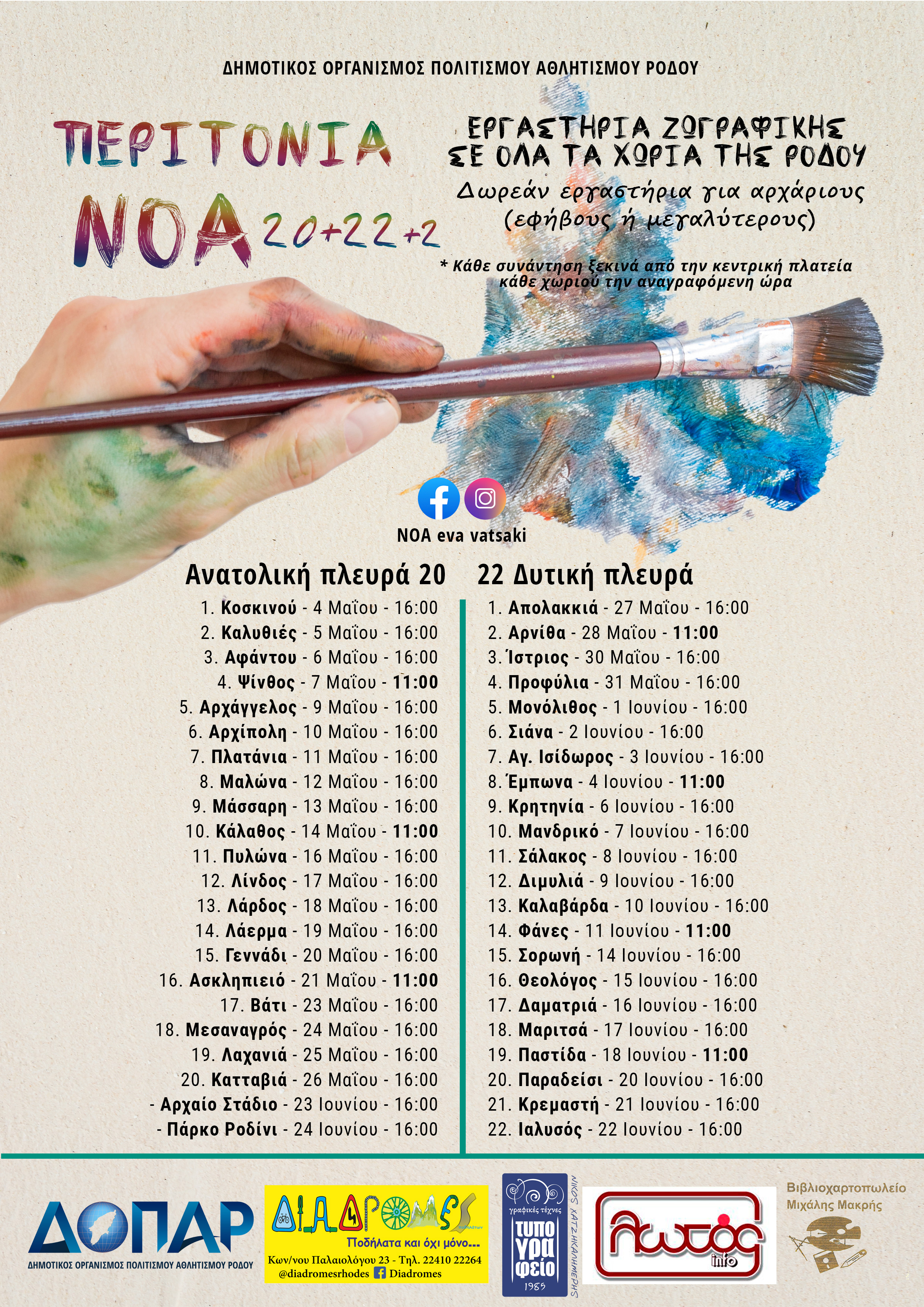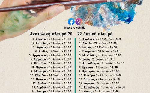 Μία σειρά 44 στο σύνολο εργαστηρίων ζωγραφικής πρόκειται να πραγματοποιηθούν στα 42 χωριά του νησιού μας και δύο ακόμη στη πόλη της Ρόδου . Η ημερομηνία έναρξης είναι η 4 Μαΐου με αφετηρία το χωριό Κοσκινού. Διατρέχοντας ένα-ένα 20 χωριά της ανατολικής Ρόδου ως και το νοτιότερο στην Κατταβιά, τα εργαστήρια θα συνεχίσουν από τη δυτική πλευρά σε 22 χωριά ακόμη, έως ότου ολοκληρωθούν στην πόλη της Ρόδου στις 24 Ιουνίου.