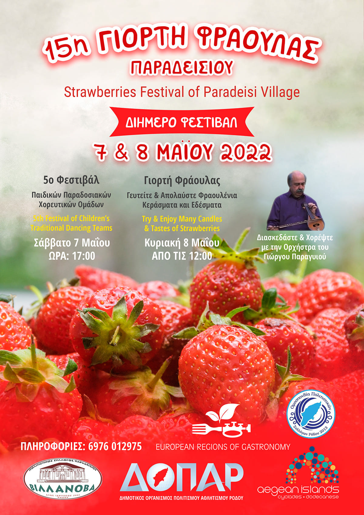 Ο Πολιτιστικός Σύλλογος Παραδεισίου "ΒΙΛΛΑΝΟΒΑ" διοργανώνει τη διήμερη γαστρονομική 15 η γιορτή Φράουλας στις 07/05/2022 (ώρα έναρξης 17:00) και