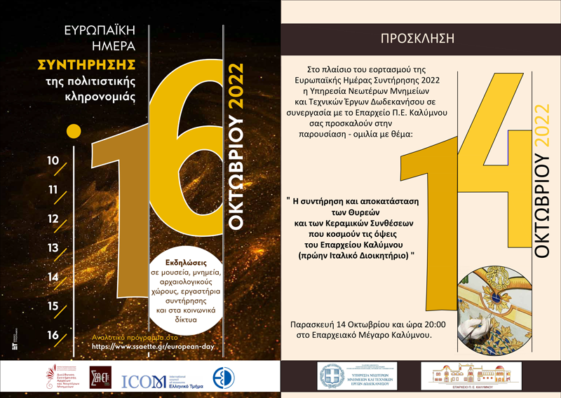 Στο πλαίσιο του εορτασμού της Ευρωπαϊκής Ημέρας Συντήρησης της Πολιτιστικής Κληρονομιάς η Υπηρεσία Νεωτέρων Μνημείων και Τεχνικών Έργων (ΥΝΜΤΕ) Δωδεκανήσου του ΥΠ.ΠΟ.Α. σε συνεργασία με το Επαρχείο Π. Ε. Καλύμνου διοργανώνουν παρουσίαση με θέμα: