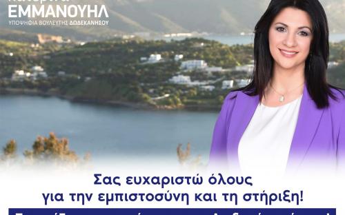 Ένα τεράστιο ευχαριστώ από καρδιάς για την εμπιστοσύνη που δείξατε στη μεγάλη δημοκρατική παράταξη της ΝΕΑΣ ΔΗΜΟΚΡΑΤΙΑΣ και τον Κυριάκο Μητσοτάκη, αλλά κυρίως σε όλους εσάς, που πιστέψατε σε μένα, ακούσατε τις απόψεις μου και με στηρίξατε με την ψήφο σας, σε αυτή την πρώτη μου προσπάθεια στην κεντρική πολιτική σκηνή. Είναι πολύ μεγάλη η χαρά μου, που συμμετείχα σε αυτό το πολύ δυνατό για τα Δωδεκάνησα, ψηφοδέλτιο βάζοντας και εγώ το λιθαράκι μου στη μεγάλη νίκη της παράταξής μας.